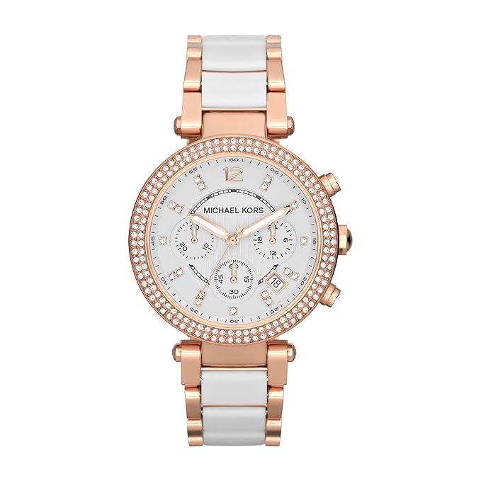 The Michael Kors Parker Watch showcases impeccable attention to detail. Featuring a chic white dial set against a dazzling rose gold-tone casing, this piece exudes a versatile charm. The delicate accents of crystal embellishments around the bezel amplify its beauty, making it a statement accessory for any occasion.